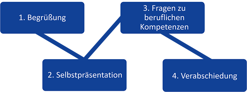 Auch ein Vorstellungsgespräch hat einen eigenen Handlungsablauf und verschiedene Elemente. Wir geben dir passende Vorstellungsgespräch-Tipps und zeigen dir wie viel Zeit die meisten Unternehmen den einzelnen Teilen zumessen. Allerdings solltest du dich nicht vollkommen auf diese Vorstellungsgespräch Tipps verlassen, da es hier immer wieder bei einzelnen Unternehmen zu Abweichungen kommen kann. So legen verschiedene Unternehmen und Branchen unterschiedliche Schwerpunkte und fokussieren somit bestimmte Teile des Vorstellungsgesprächs anders. In der Regel baut sich ein Vorstellungsgespräch nach folgendem Schema auf: