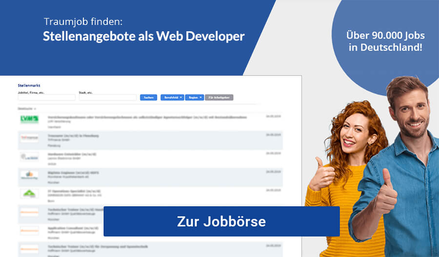 Wenn du also Spaß an Programmiersprachen hast und dir diese leicht aneignen kannst, hast du eine gute Basis für den Job als Webentwickler oder Web Developer. Doch eine einheitliche Ausbildung oder ein Studium als Web Developer oder Webentwickler gibt es nicht. Auch wenn eine Ausbildung oder ein Studium der Informatik hilfreich sein kann, musst du dich um die Feinheiten der Verknüpfung von Front- und Backend selbst kümmern, bis du sie sicher beherrschst.